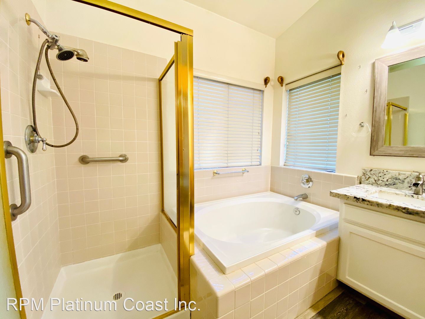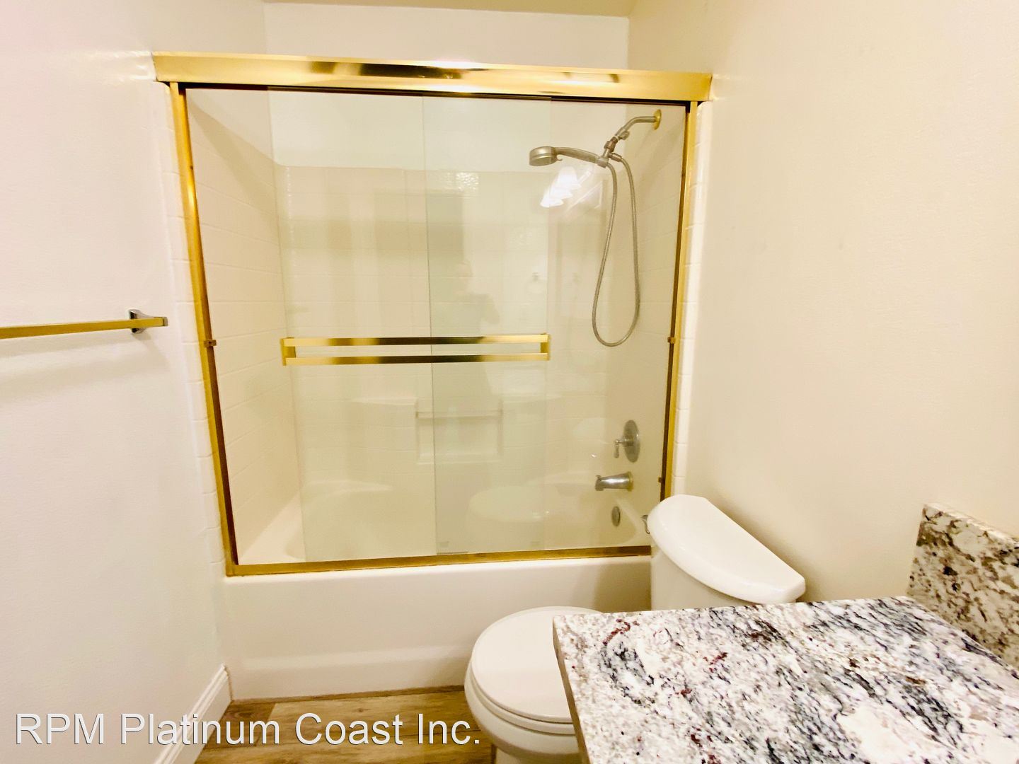 Guest bathroom has granite counters and tub/ shower combo.