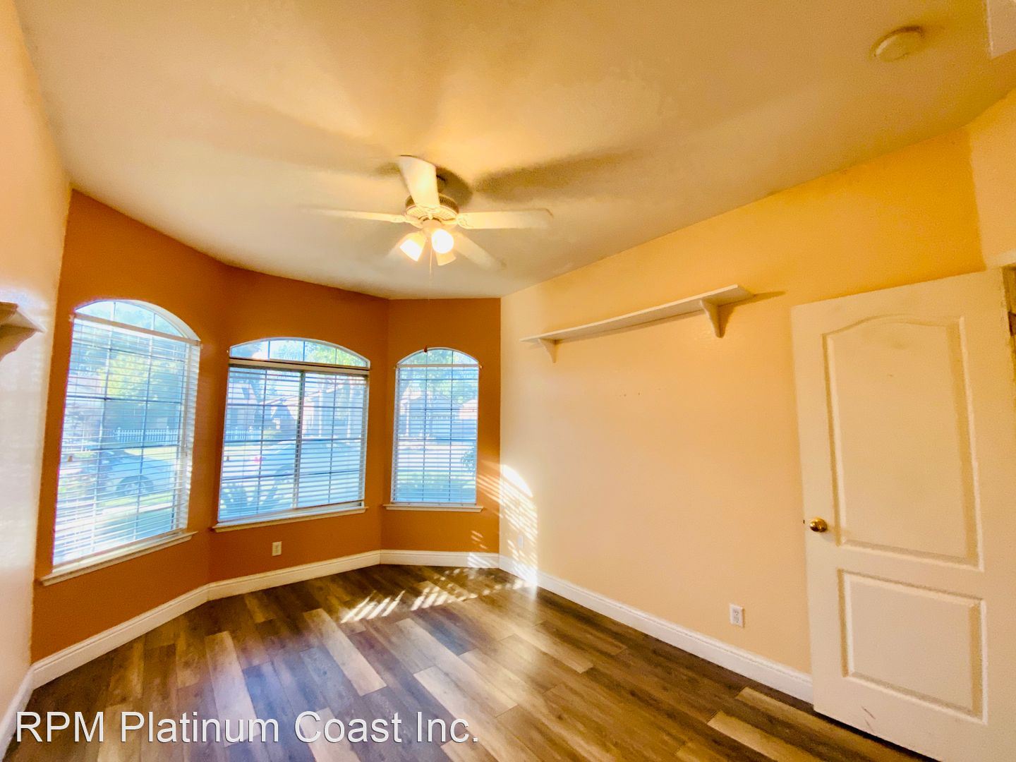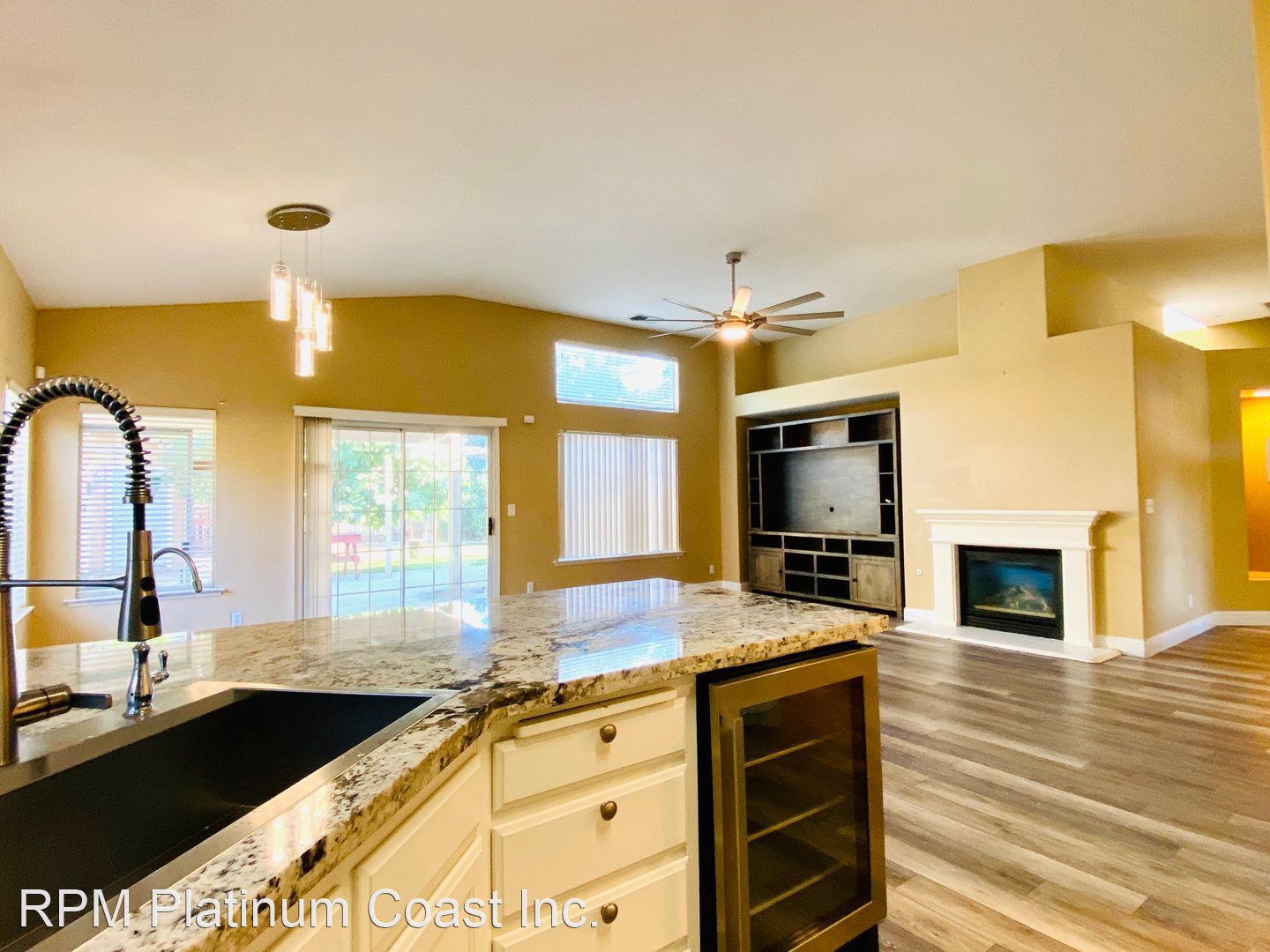 Great room has a large remote ceiling fan and great windows and sliding door for natural light.