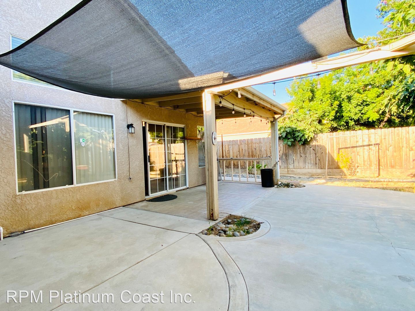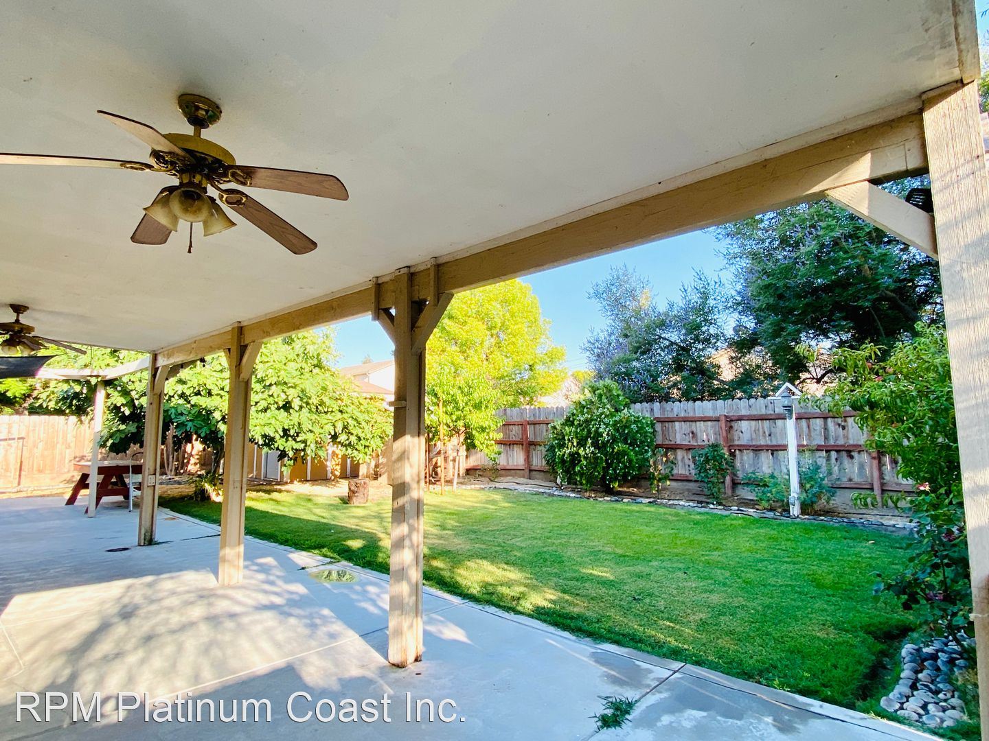 Backyard has large covered patio with ceiling fans. Backyard is beautifully landscaped with fruit trees including lemon, fig, guava, and nectarines.
