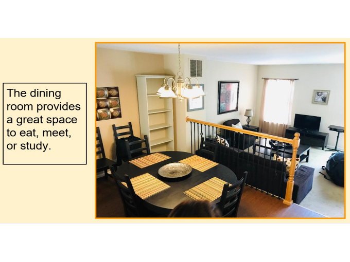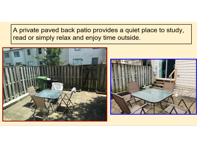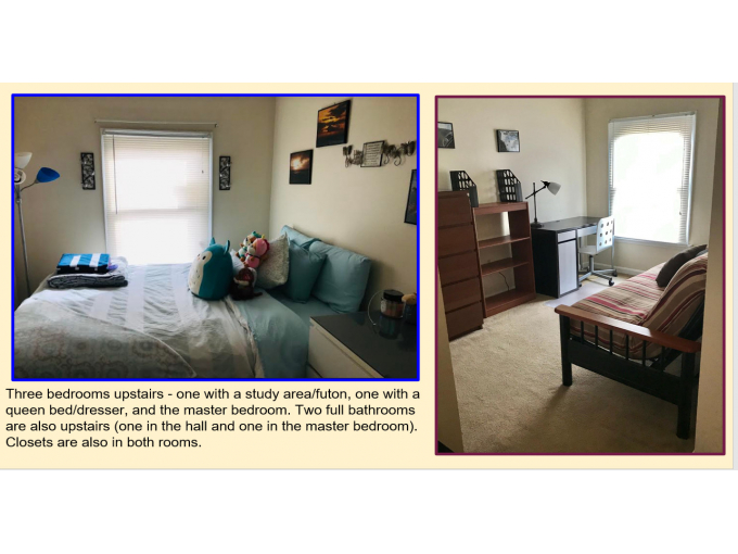 Student tenant to share fully furnished townhome with 2 other student tenants.  Tenants may divide rent in any reasonable manner (monthly rent shown is based on pure 1/3 allocation).  Need two more student tenants in addition to the existing tenant.  Room is one of 3 bedrooms, some established study areas with desks, 3.5 baths with each tenant having her own full bathroom with all bathrooms being fully renovated (two were completed at the end of 2022); Full access to common areas that include updated kitchen with granite counter tops and stone backsplash, dining room, step down living room, powder room on common floor and private fenced-in back patio with pavers and patio furniture; ADT, Ring cameras and other enhanced security features including security gates added in early 2024; excellent location close to campus, Inner Harbor, MARC trains, and stadiums; very quiet setting in a courtyard community; Prefer clean, courteous tenants who are focused and dedicated to their studies. (Google presentation available with additional photos from Landlord if requested)